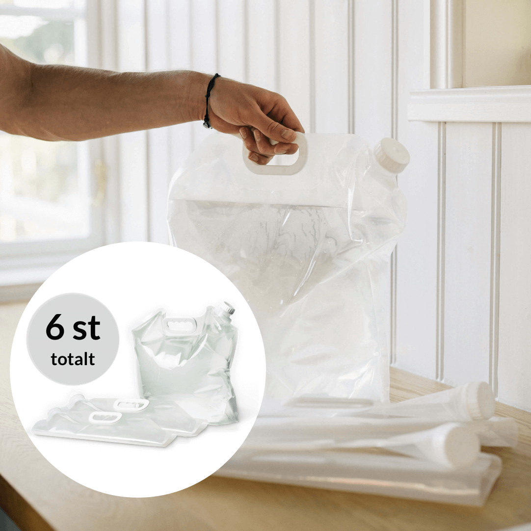 Lätta att förvara och smidiga att fylla på med vatten när du behöver det. Varje behållare rymmer 10 liter och kan enkelt fällas ihop när den inte används, vilket sparar plats i din beredskapslåda.